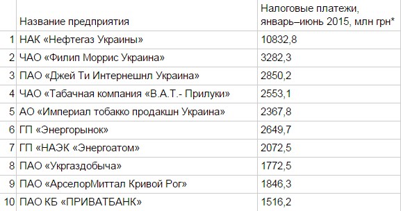 Как сообщили в украинском налоговом ведомстве, по итогам первого полугодия 2015 года ПриватБанк перечислил 1 млрд 516 млн грн налогов и сборов и входит в топ-10 крупнейших компаний–налогоплательщиков Украины. По данным ГФС, в первом полугодии ПриватБанк стал абсолютным лидером и крупнейшим налогоплательщиком в банковской сфере. Для сравнения, государственный «Ощадбанк» замыкает десятку лидеров налогоплательщиков в банковском секторе, уплатив государству за январь–июнь 72,8 млн гривен.