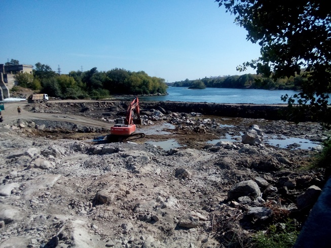 В предыдущие годы, при нормальном водонасыщении реки, выполнение таких работ было крайне сложным, так как для их проведения отводящий канал должен быть полностью осушен. Нынешнее маловодье позволило это сделать. Отводящий канал отсечен от реки временной плотиной, для автомобильного транспорта, вывозящего породу, организованы два съезда, для откачки воды из котлована спланирован специальный приямок. Каменные валуны дробятся ударной гидроклиновой установкой с предварительным сверлением в скале вертикальных скважин.