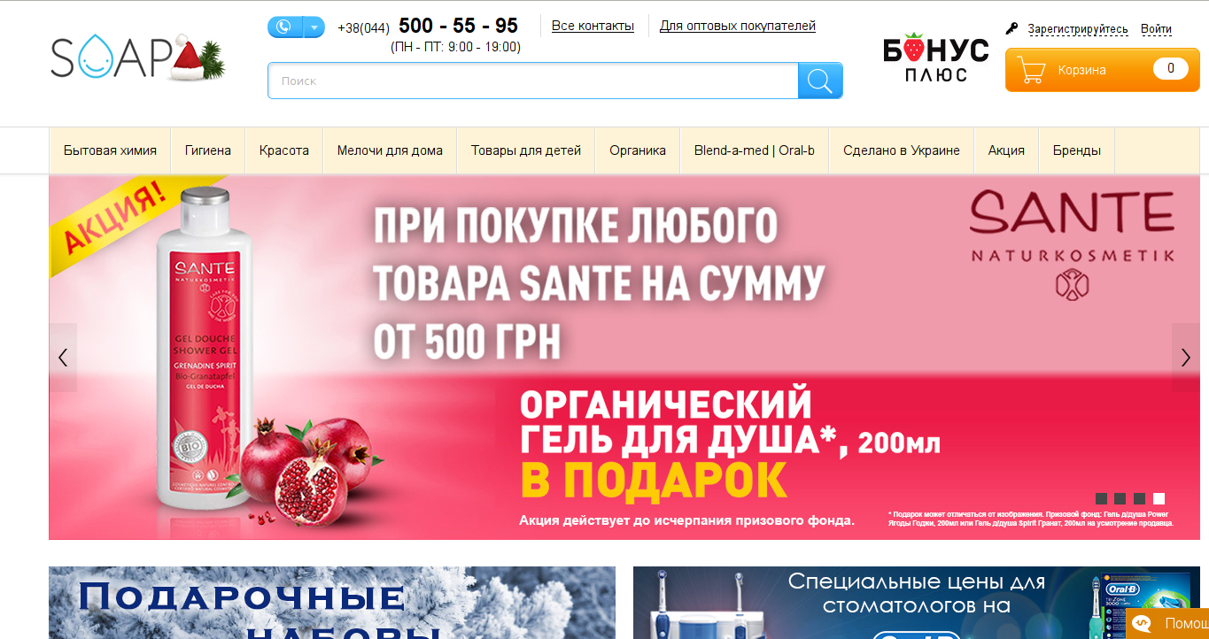 Интернет-магазин Soap.ua создан, чтобы покупатель мог в одном месте выбрать всю необходимую бытовую химию и косметику. В ассортименте магазина товары таких известных брендов, как Ariel, Tide, Vanish, Lenor, Sodasan, Frosh. Есть товары для гигиены торговых марок Gillette, Nivea, Oral-b, Dove, Camay и др. Косметика по уходу за лицом и телом представлена как органическими марками Lerbolario, Sante, Logona, O’Herbal, так и популярными брендами Wella, Olay, Bübchen и др. Интернет-магазин Soap.ua постоянно развивается и совершенствуется для того, чтобы с каждым днем дарить своим любимым клиентам еще больше радости от качественных товаров и высокого уровня сервиса.