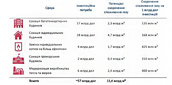 Согласно информации Минрегиона, на санацию многоквартирных домов необходимо 17 миллиардов долларов, на санацию индивидуальных домов - 28 млрд долларов, на замену индивидуальных котлов - 4 миллиардов долларов, на санацию общественных зданий - 2 миллиардов долларов, на модернизацию производства тепла и сетей - 6 миллиардов долларов.