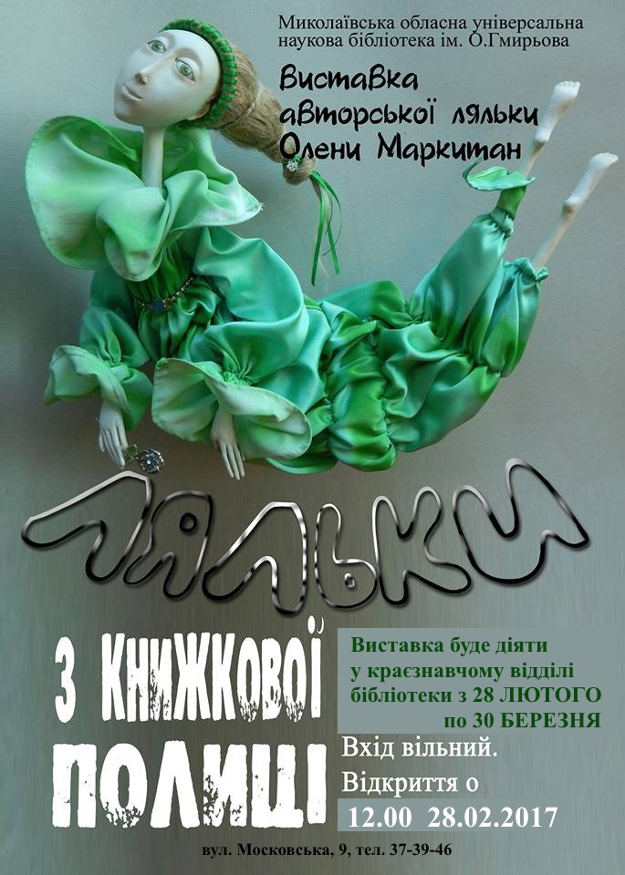 В отделе документов и научных исследований по вопросам краеведения Николаевской областной универсальной научной библиотеки имени Гмырева с 28 февраля будет экспонироваться выставка кукол. Автор работ – художница и преподаватель Николаевской детской художественной школы Елена Маркитан.