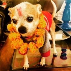 В этот день собакам всячески угождают и рисуют им на лбу красную точку - тику.