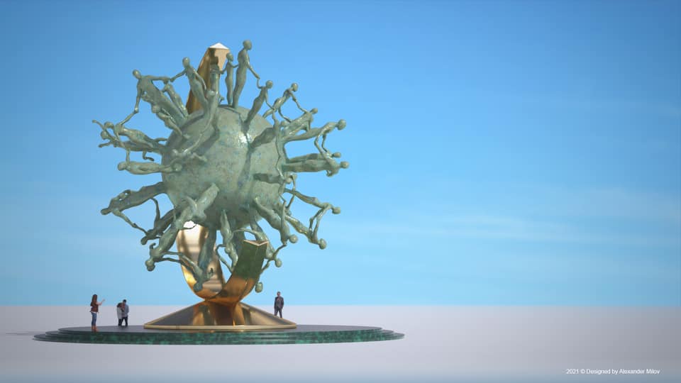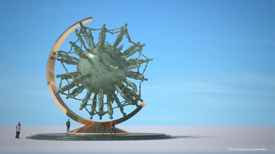 Молекула коронавируса с шипами будет иметь форму Земли, на поверхности которой стоят люди, взявшись за руки. При этом каждая фигура также будет состоять из тысяч обнявшихся людей, находящихся друг у друга на плечах и символизируя разные социальные группы и их ценности, объединенные одной проблемой — пандемией. Всего в композиции будет 56 фигур взрослых и детей без ртов. Это — еще один способ показать ограничения, в которых оказалось человечество из-за вируса.