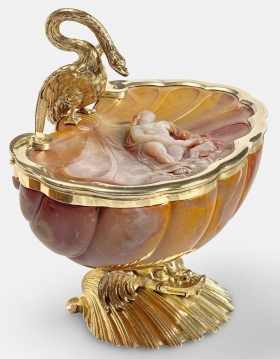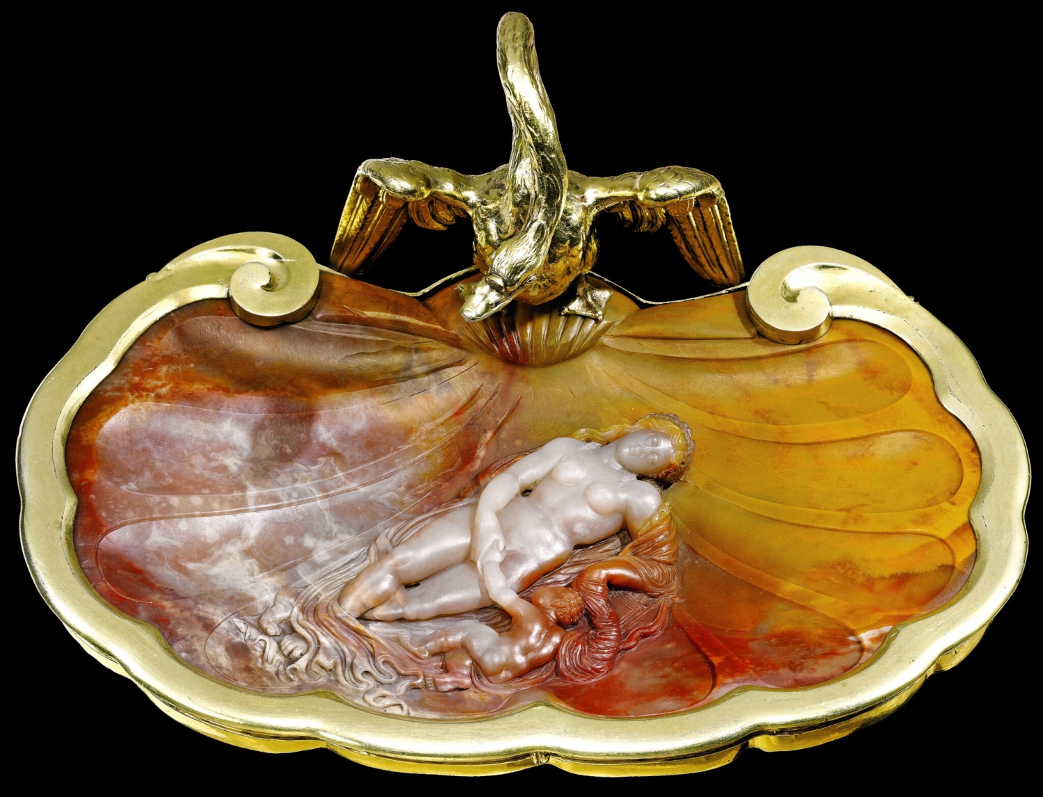 Тщательно вырезанная из цельного агатового камня, привезенного из немецкого Граубюндена, камея изображает Венеру, томно лежащую на раковине (возможно, той, в которой она родилась), а ее сын Амур свернулся калачиком рядом с ней, держа богиню любви за руку. Резьба в полной мере использует естественные цветовые вариации агата, чтобы противопоставить перламутровую бледную кожу Венеры на фоне богатой охры ракушки под ней. Камея обрамлена позолоченной серебряной каймой и позолоченным лебедем с распростертыми крыльями, возвышающимися над матерью и младенцем.