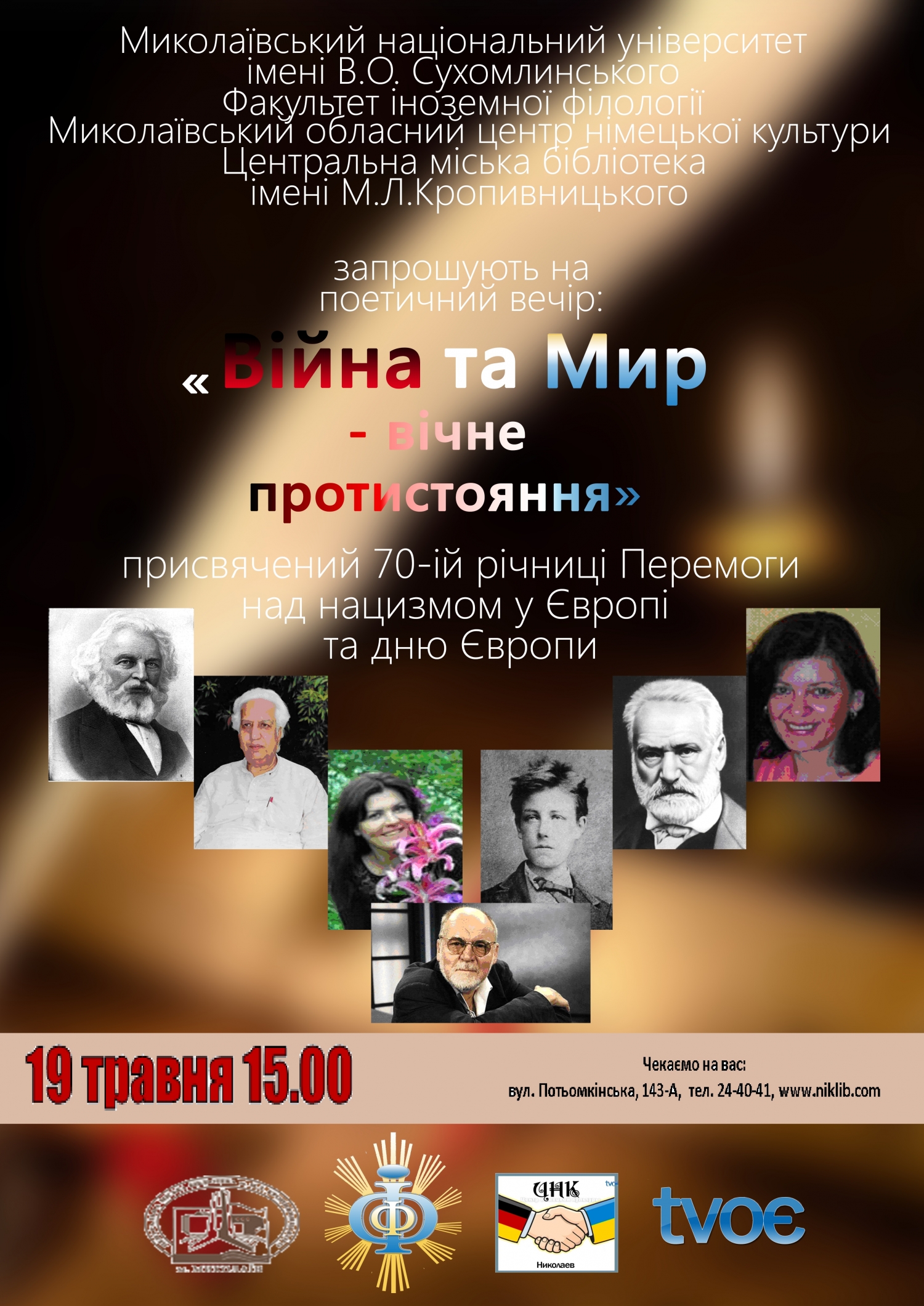 19 мая факультет иностранной филологии Николаевского национального университета имени В.А. Сухомлинского совместно с Николаевским областным центром немецкой культуры и Центральной городской библиотекой имени М.Л. Кропивницкого проведет поэтический вечер «Война и мир – вечное противостояние», посвященный 70-й годовщине Победы над нацизмом в Европе и по случаю Дня Европы.