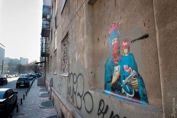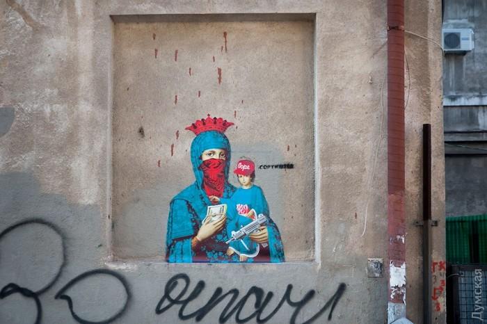 На стене дома в Одессе появилась икона Богоматери с пачкой долларов и автоматом руках