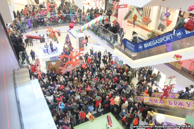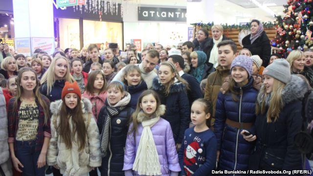 Горожане пели колядку 6 января в одном из торговых центров, разместившись на трех этажах.