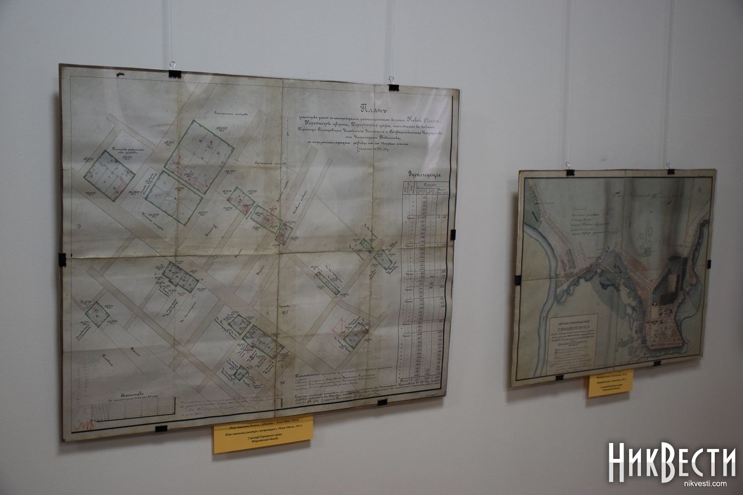 Ряд предметов на выставке последовательно отображает процесс застройки Николаева. Это планы важных зданий, промышленных объектов, районов города и предместий. Особое внимание уделяется методике картографической съемки и производства карт и планов. Посетители смогут ознакомиться с технологией работы геодезических приборов: теодолита, нивелира, бусоли; узнать, с помощью каких инструментов происходит считывание картографической информации.