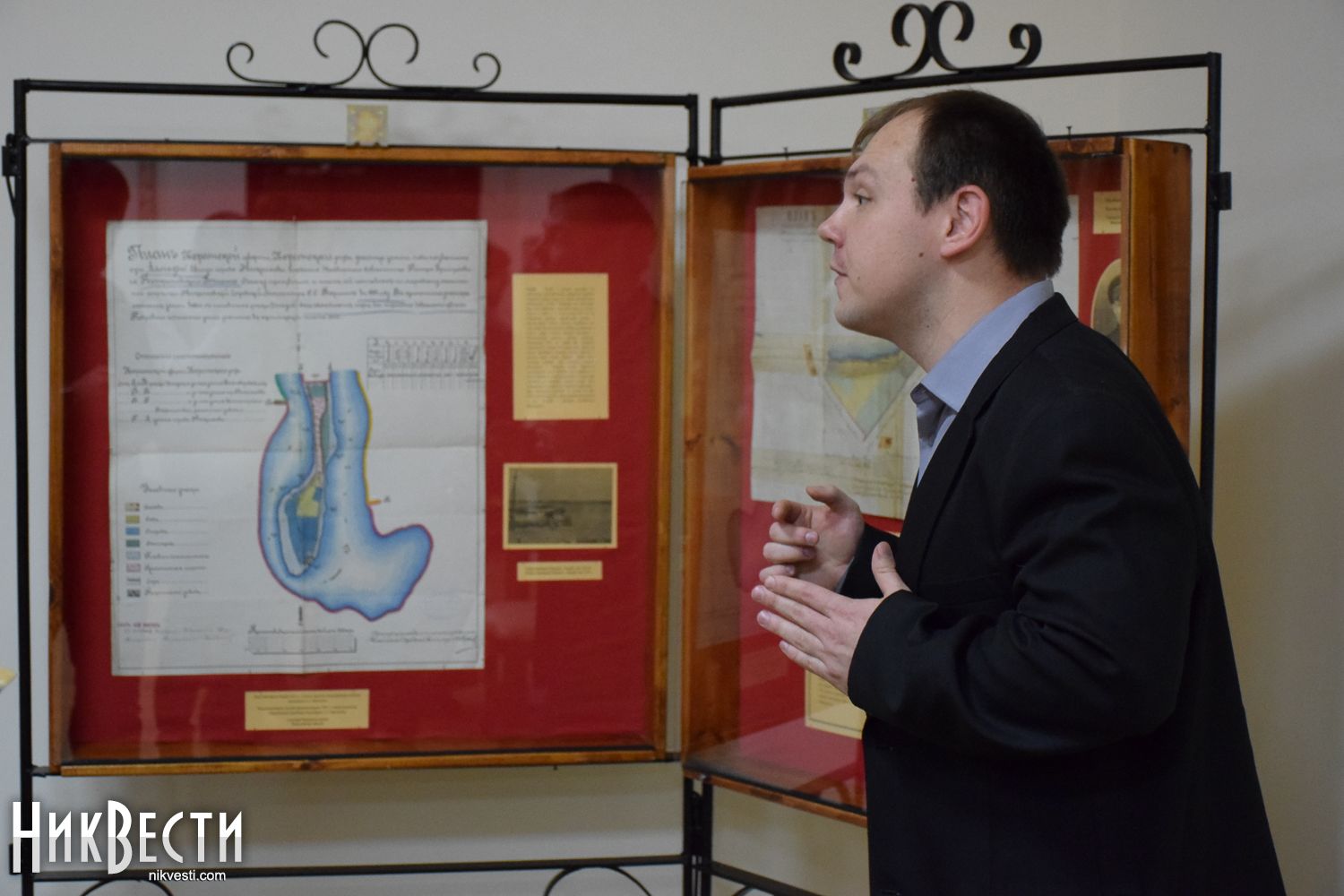 – Самая старая карта на выставке – это карта рек Южный Буг и Ингул с указанием населенных пунктов и экономическим приложением 1796 года. Большую ценность имеют план полуострова Аляуды (1826 год), красивый цветной план Николаева в литографической печати (1837 год), а также план гостиницы Большая Московская 1929 года, – рассказал идейный вдохновитель проекта, заместитель директора музея Валерий Чернявский.
