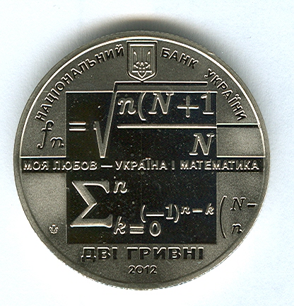 На аверсі монети розміщено: малий Державний Герб України та напис півколом НАЦІОНАЛЬНИЙ БАНК УКРАЇНИ, фрагмент формули М. П. Кравчука, посередині – вислів ученого МОЯ ЛЮБОВ – УКРАЇНА І МАТЕМАТИКА, унизу номінал – ДВІ ГРИВНІ, рік карбування монети – 2012 та логотип Монетного двору Національного банку України.