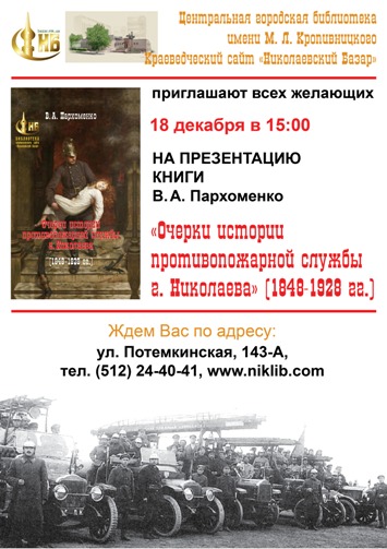 18 декабря в Центральной городской библиотеке имени Марка Кропивницкого состоится презентация новой книги «Очерки истории противопожарной службы г. Николаева (1848-1928 гг.)» Владислава Пархоменко – доктора исторических наук, доцента, заведующего кафедрой историографии, источниковедения и специальных исторических дисциплин Николаевского национального университета имени Василия Сухомлинского.