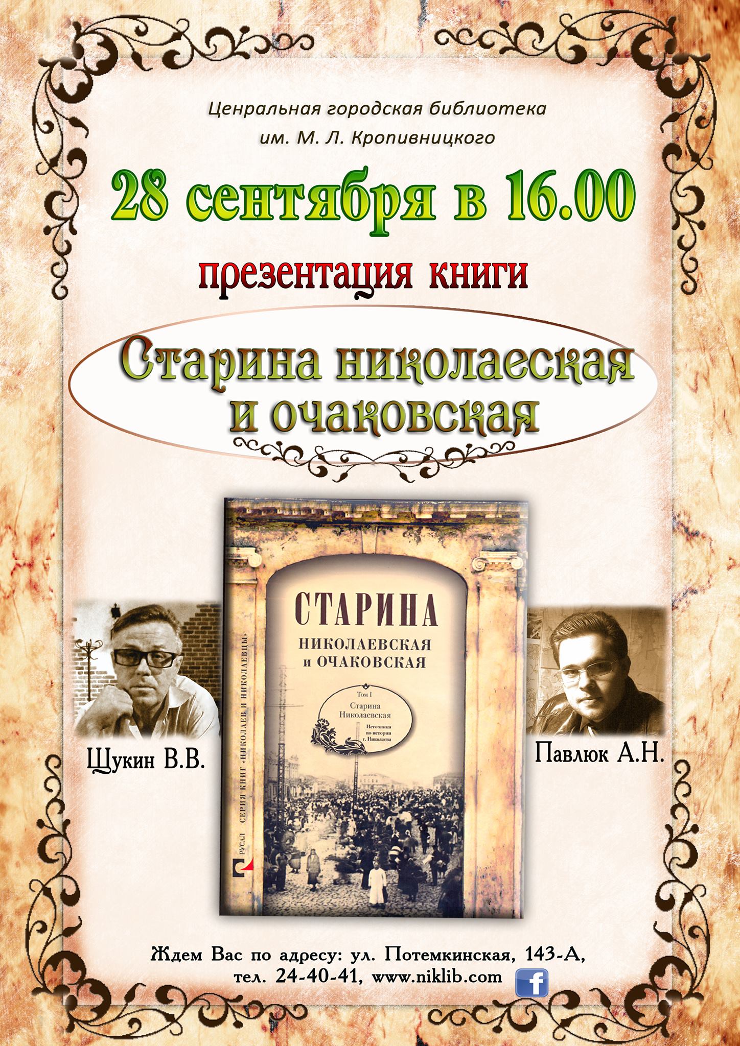 28 сентября в 16.00 в Центральной городской библиотеке имени Марка Кропивницкого состоится презентация книги «Старина николаевская и очаковская» историков и краеведов Владимира Щукина и Андрея Павлюка.