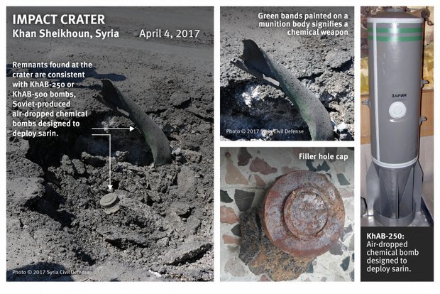 В материале говорится, что фотографии и видеозаписи, сделанные в Хан-Шейхуне, свидетельствуют о том, что там предположительно были использованы авиационные бомбы советского производства, которые специально создали для доставки зарина. Речь идет о бомбах ХАБ-250 или ХАБ-500. На осколках из провинции Идлиб, изображения которых приводит правозащитная организация, видна зеленая маркировка, которая наносилась именно на подобные боеприпасы.