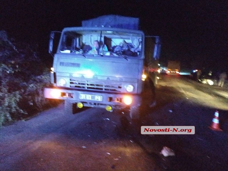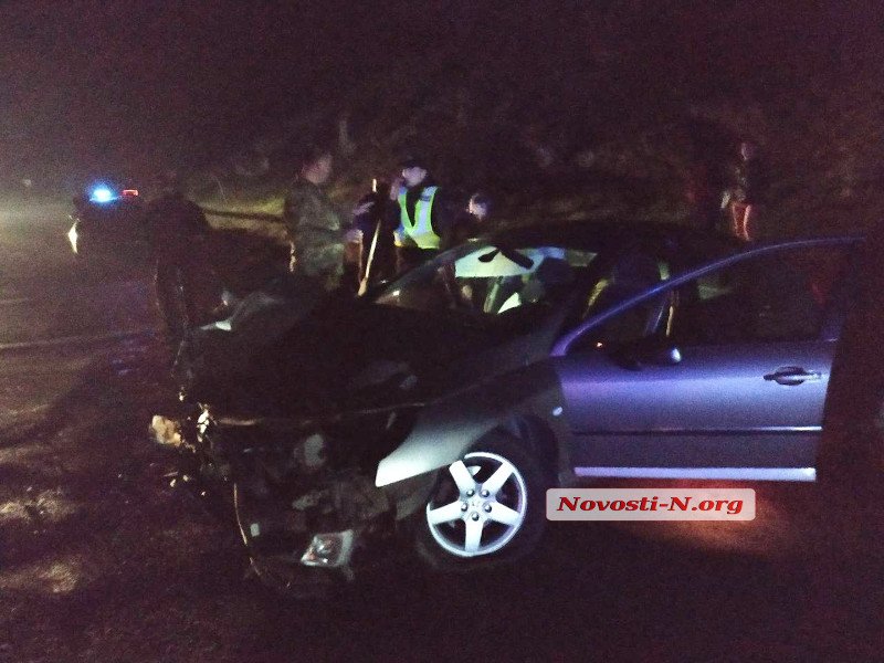 «Пежо» ехал по трассе «Николаев-Ульяновка» со стороны Первомайска в направлении Вознесенска. В селе Мигея на крутом спуске водитель не справился с управлением, выехал на встречную полосу движения и врезался в двигавшийся во встречном направлении армейский седельный тягач КамАЗ.