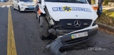Во время маневра микроавтобус Mercedes врезался в бок легкового автомобиля, который от удара отбросило. Также «скорая помощь» сбила дорожный знак на пешеходной части.