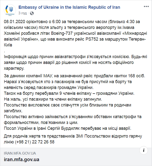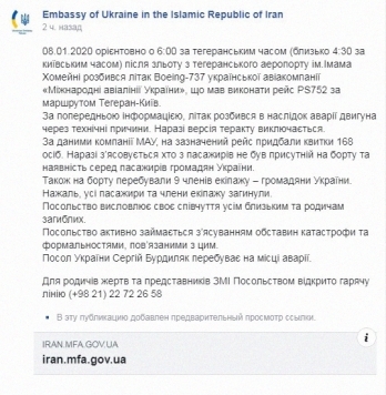 Посольство Украины в Иране отредактировало сообщение о катастрофе лайнера МАУ