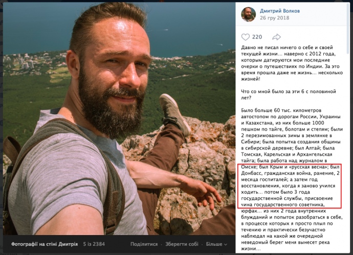 Дмитрий Волков из Москвы, чья дата рождения совпадает с датой рождения подозреваемого, сам писал на собственной странице, что был в Крыму во время «русской весны» и на войне в Донбассе, которую он называет «гражданской». Волков утверждает, что получил на войне ранения, 2 недели был в госпитале. Впоследствии он пошел на государственную службу и получил чин государственного советника.