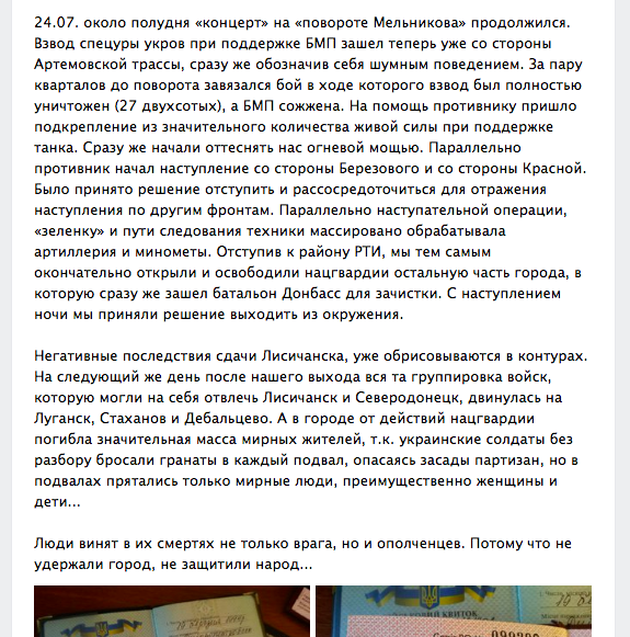 В 2014 году он также описывал свое участие в том же бою, о котором говорит украинская прокуратура и публиковал фото документов украинских военных. На данный момент занимается производством соков.