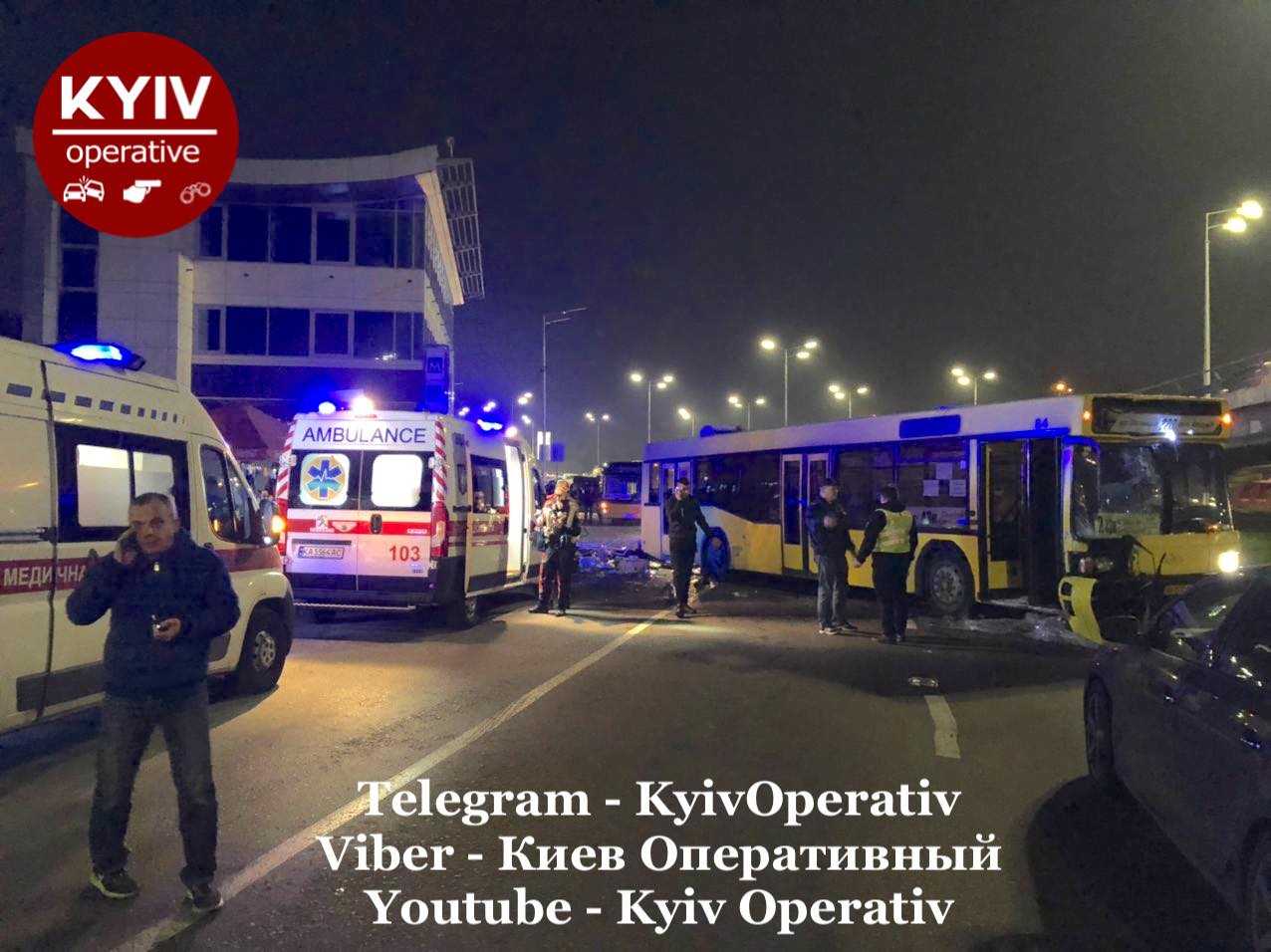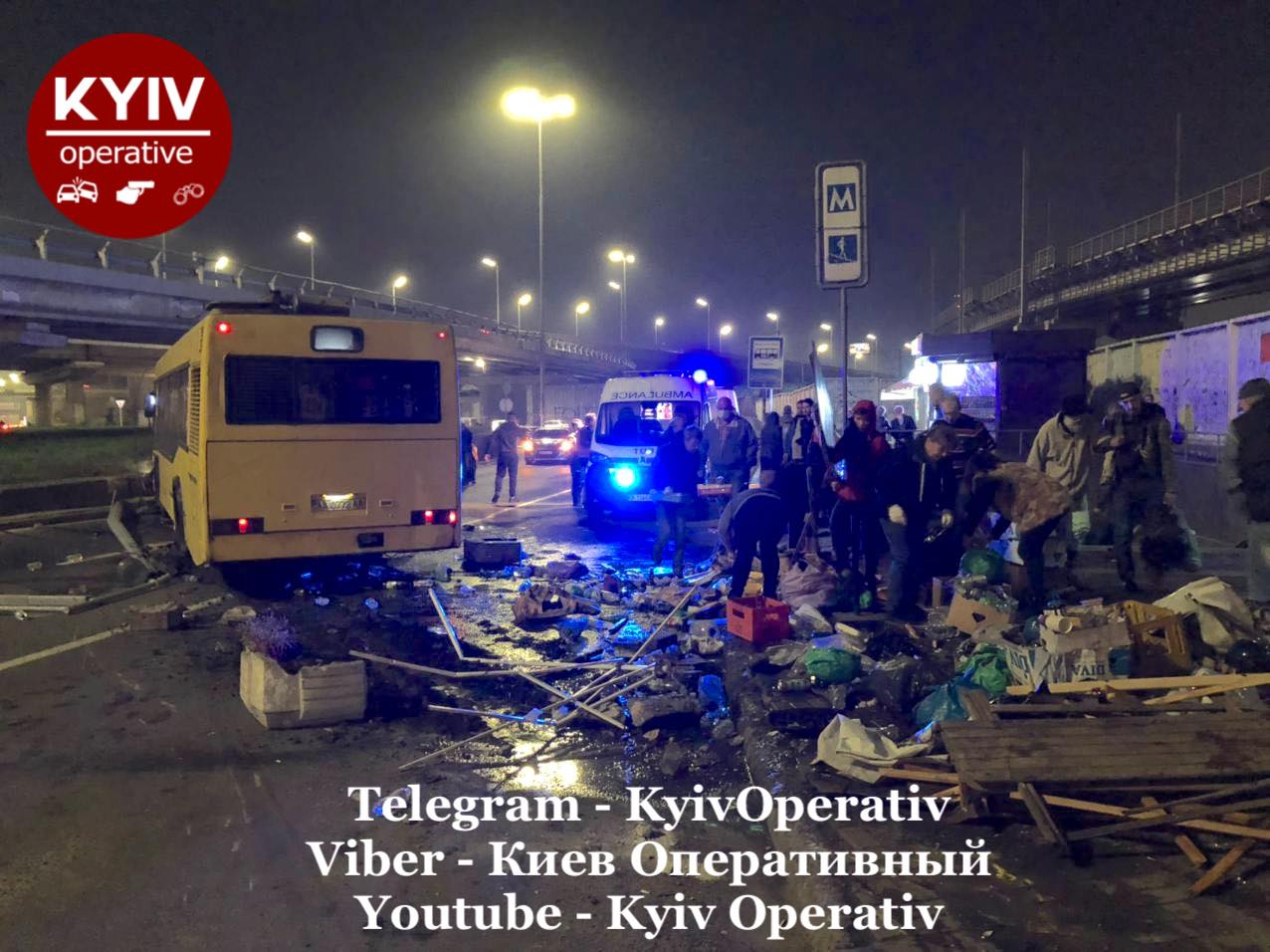 «Только что на Выдубичах маршрутный автобус на полной скорости снес палатку с продуктами, сбил столб. Под автобусом оказалась женщина. Вытащили, вроде живая», — отмечается в сообщении.