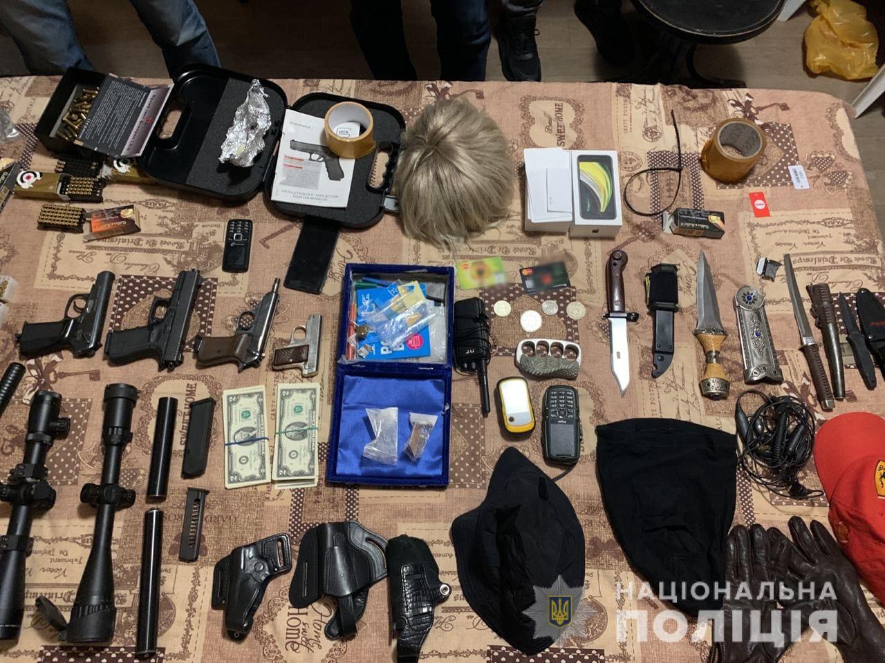 При проведении обысков по местам их проживания работники полиции обнаружили и изъяли большое количество оружия различной модификации, боеприпасы, кастеты, ножи, балаклавы, рации, парики, перчатки, мобильные телефоны, банковские карты, наркотики и деньги. Также изъяты автомобили, на которых передвигались злоумышленники.