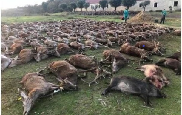 В центре Португалии, на территории охотничьей зоны недалеко от Лиссабона, 16 охотников убили 540 оленей и диких кабанов и опубликовали в соцсети соответствующие фото.