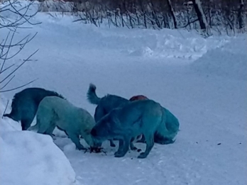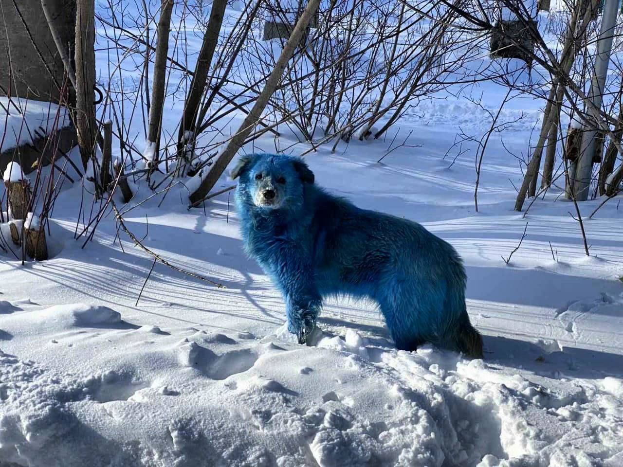 В российском городе Дзержинск местные жители обеспокоены нашествием бродячих собак, шерсть которых окрашена в синий цвет.