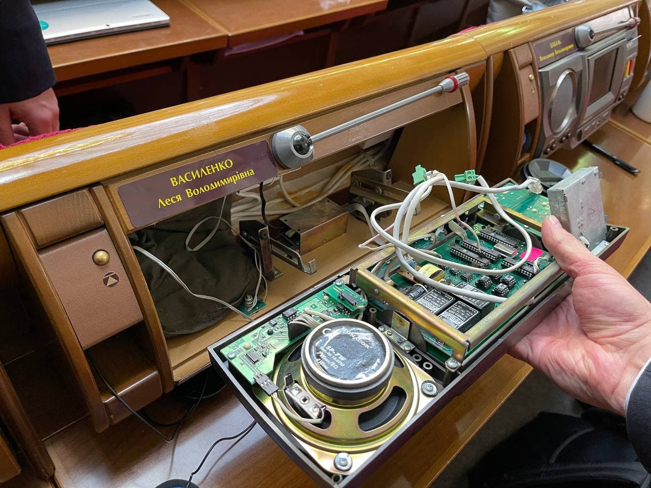 Он также обнародовал фото — возгорание произошло в пульте голосования депутата от «Голоса» Леси Василенко.
