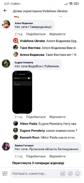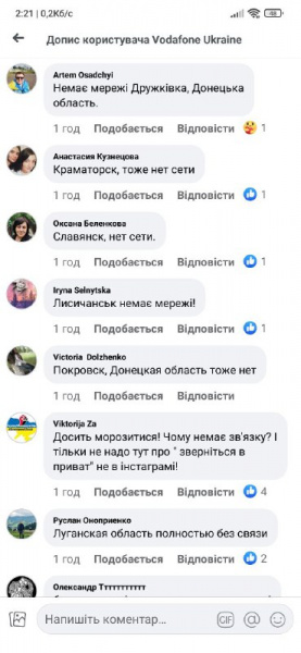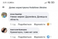 Пользователи в Facebook сообщали, что связи Vodafone нет у жителей Славянска, Краматорска, Покровска, Белокуракино, Северодонецка и других городов.