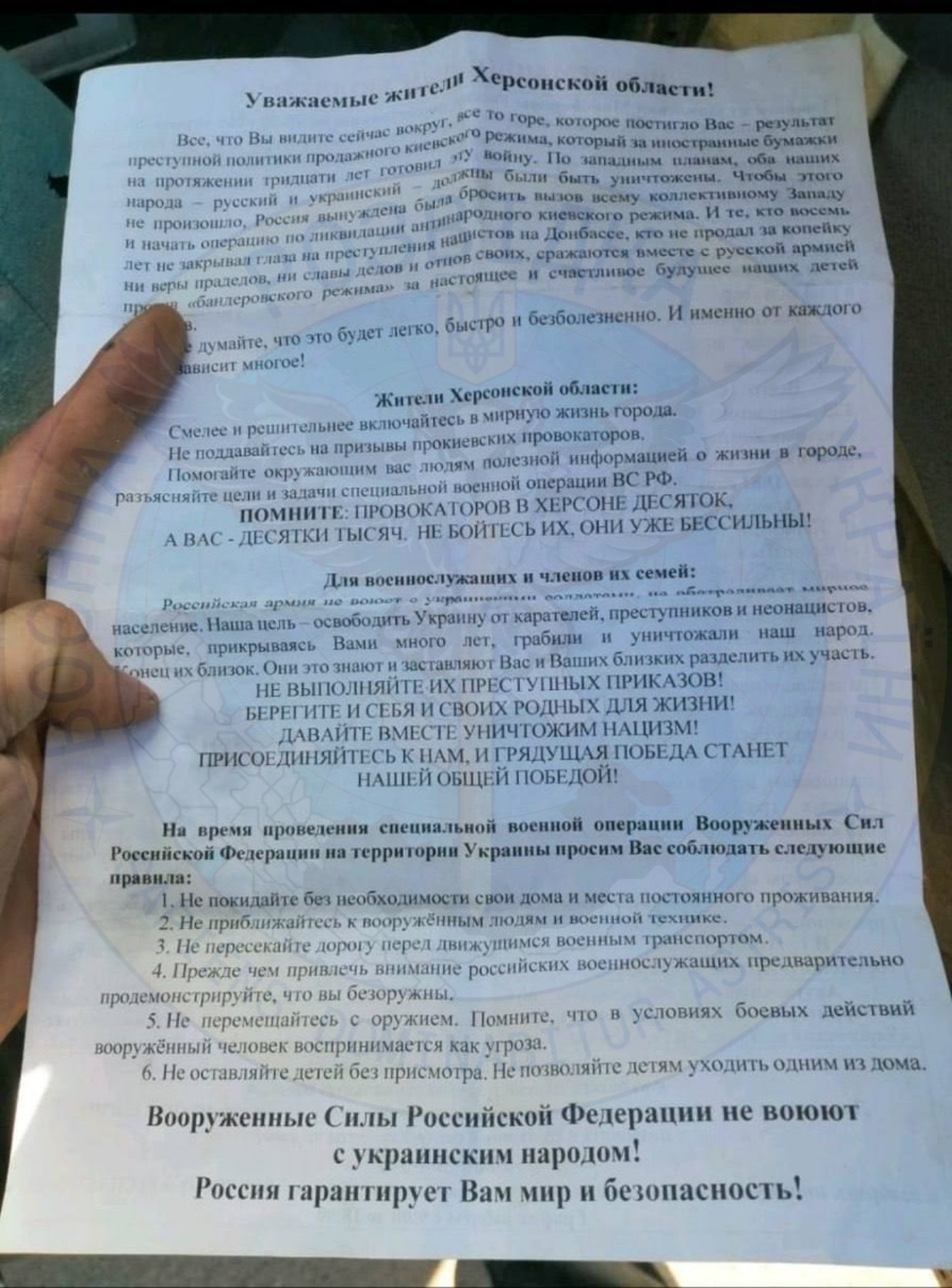 Украинцев призывают к коллаборации с оккупантами и предупреждают о риске приближаться к российским военным. В листовке, после зверств в Буче, утверждается, что «Россия не воюет против украинских военных и не наносит вреда гражданским».