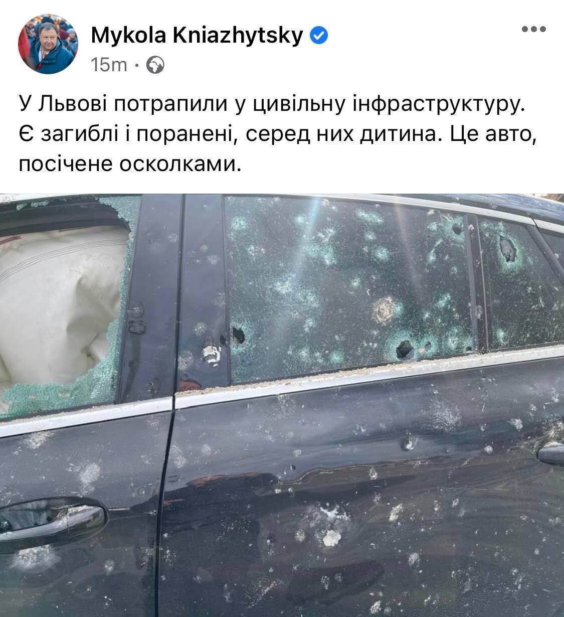 Кроме того, народный депутат Княжицкий сообщил, что в результате обстрелов во Львове есть пострадавшие. Он также показал фото автомобиля, иссеченного обломками.