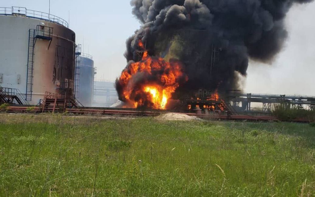 Россияне обстреляли нефтеперерабатывающий завод в Лисичанске — второй по мощности в Украине. В настоящее время есть угроза взрыва. Из-за артиллерийских обстрелов РФ украинские спасатели прекратили тушить пожар и покинули опасную зону.
