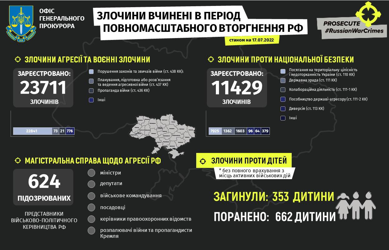 По состоянию на утро 17 июля из-за войны России против Украины погибли 353 детей, ранения получили еще 662 ребенка.