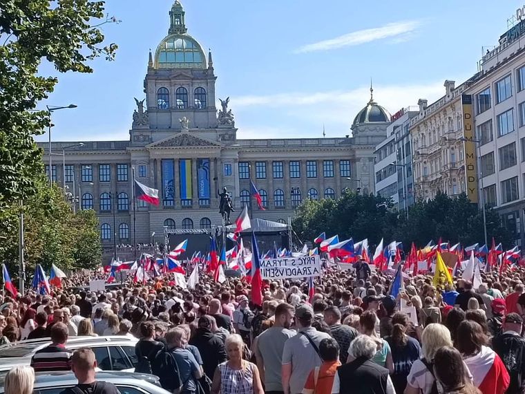 Демонстранты принесли чешские флаги, барабаны и транспаранты. Толпа скандировала «Довольно!» У некоторых были плакаты с лозунгами против ЕС, НАТО, премьер-министра Чехии Петра Фиалы, «Зеленого курса» для Европы и против отказа правительства сотрудничать с россией. На площади также стоят флаги Коммунистической партии Чехии и евроскептического движения Триколор.