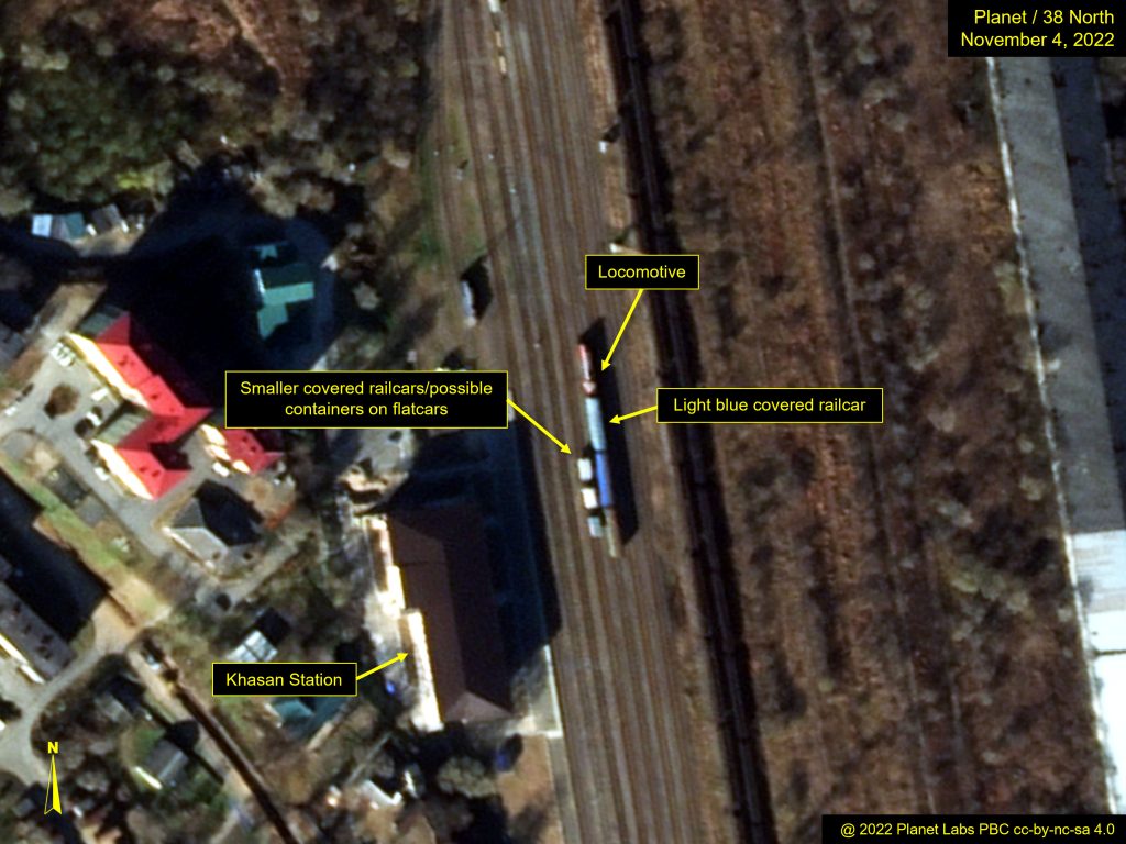 «В пятницу утром в 10:24 по местному времени (01:24 UTC) на одном из путей рядом с зоной обработки грузов был виден склад из трех закрытых вагонов. Восточный вагон светло-голубой, второй кажется более темно-синим, а задний вагон красновато-коричневого цвета», – говорится в публикации.
