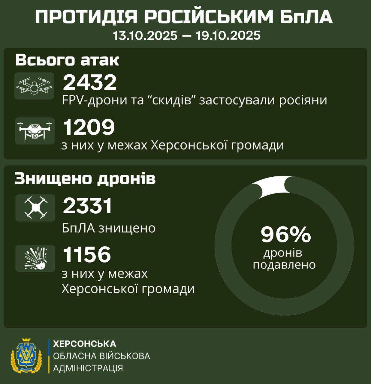 За прошедшую неделю украинские военные уничтожили 96% дронов, которыми россияне атаковали Херсонскую область, половину из них — над Херсоном.