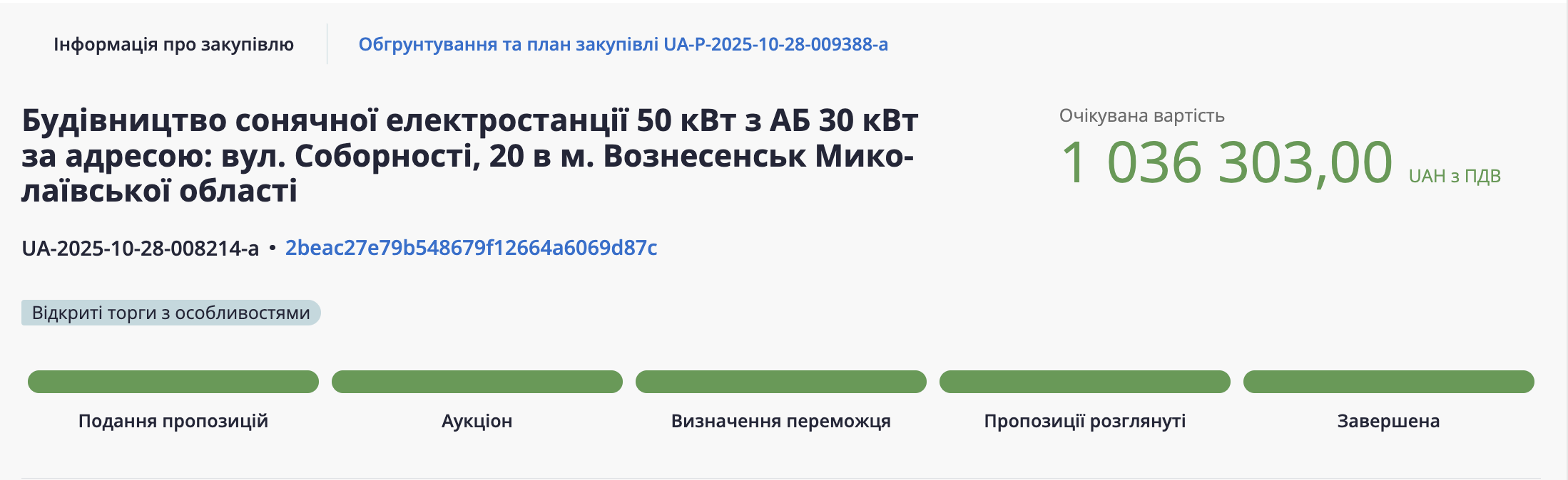 В Вознесенске до конца года планируют завершить строительство солнечной электростанции мощностью 50 кВт. Ожидаемая стоимость проекта составляет 1 миллион 36 тысяч 303 гривен.