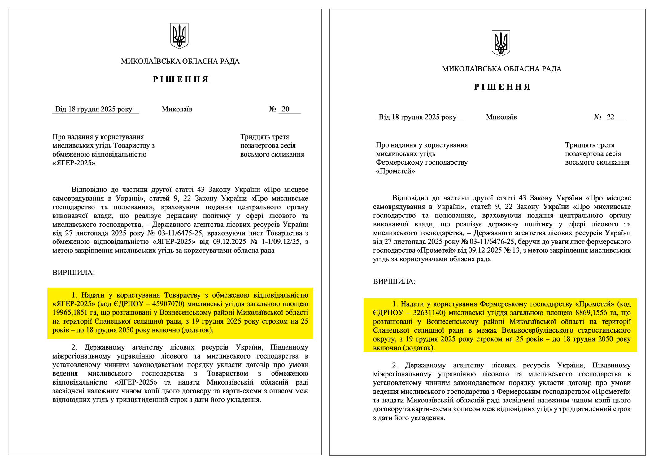 Накануне инцидента 18 декабря Николаевский областной совет провел пленарное заседание сессии и предоставил предприятиям «Охотник-2012», «Прометей», «Широколановское» и «ЯГЕР 2025» разрешение на пользование охотничьими угодьями, в частности в Вознесенском районе Николаевской области — на 25 лет до декабря 2050 года.