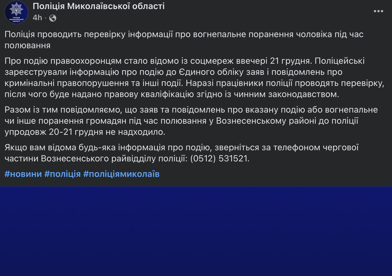Заявление о начале проверки появилось на официальной странице Главного управления Национальной полиции Николаевской области утром 22 декабря.