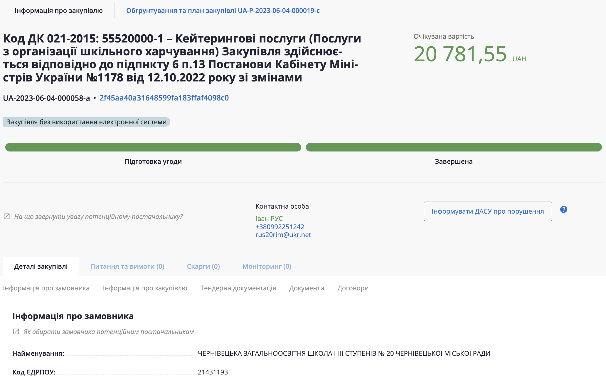 Кроме того, в ходатайстве содержится номер договора по неточному государственному классификатору в системе Prozorro, который ведет на закупку кейтеринговых услуг, проводимую школой в городе Черновцы.