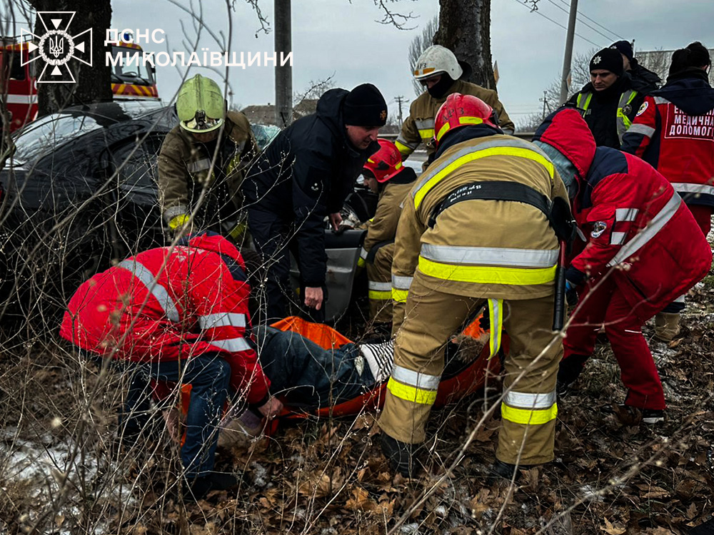 В Николаеве спасатели деблокировали пассажирку из поврежденного автомобиля. Фото: ГСЧС Николаевской областиВчера, 8 февраля, в Николаеве на проспекте Богоявленском произошла авария. Водитель легкового автомобиля Hyundai не справился с управлением и врезался в дерево.