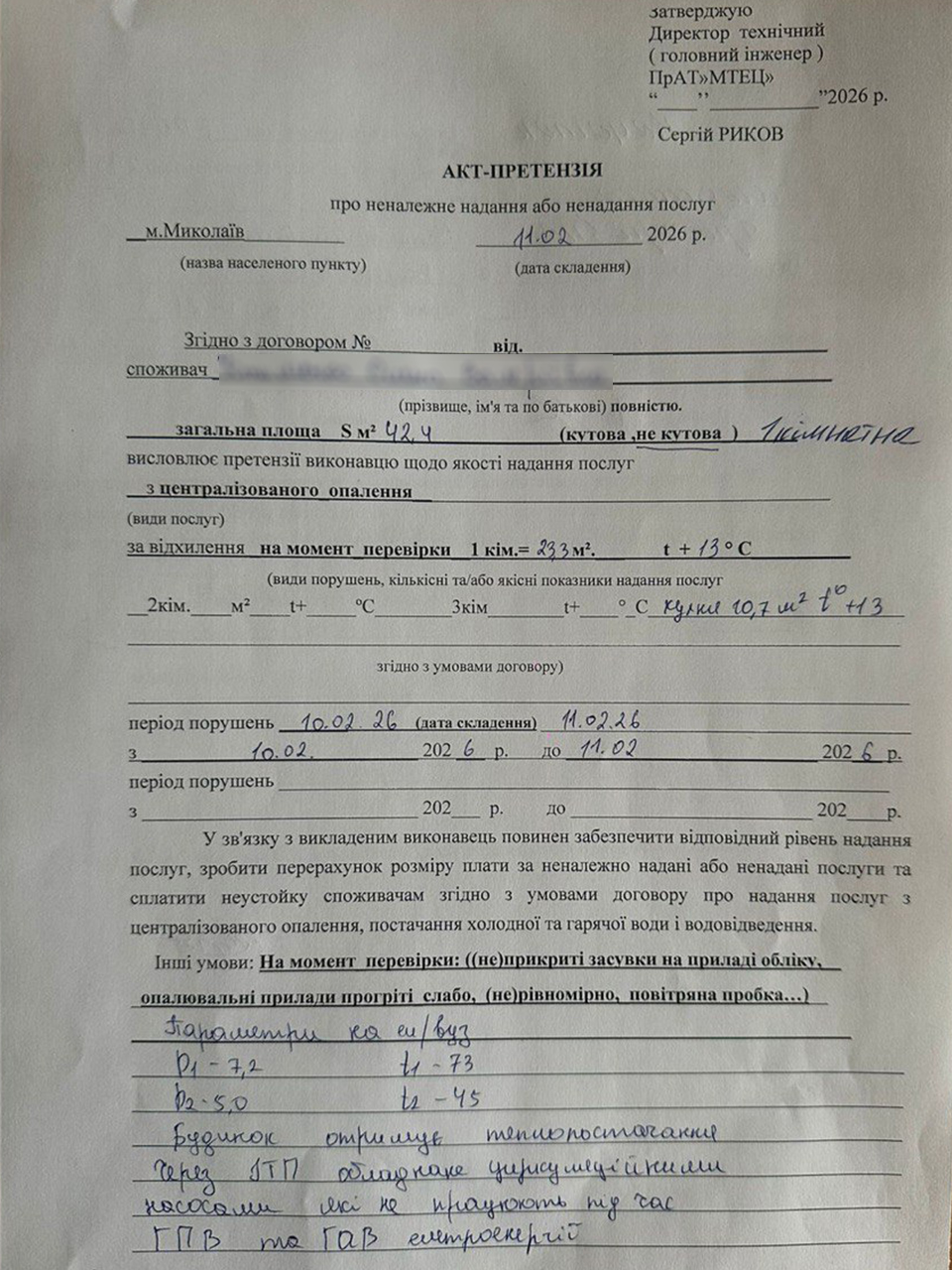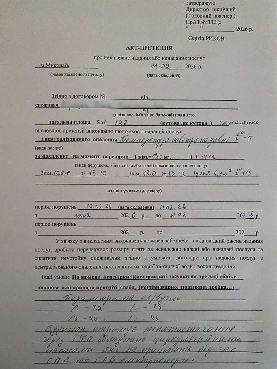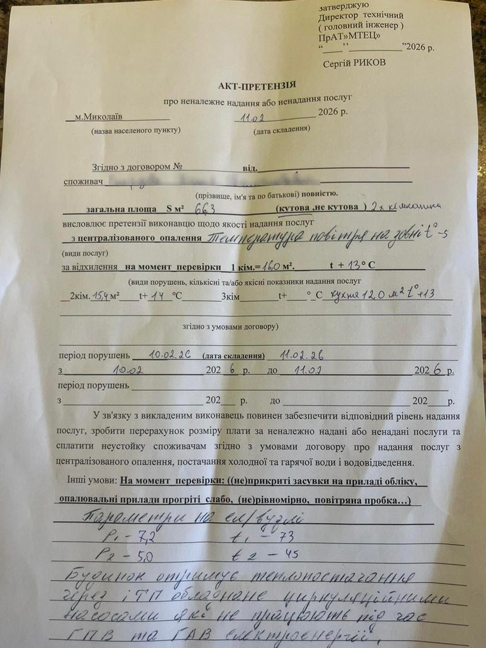 — У меня угловая квартира, и температура в комнате около 10°. У нас 16-этажный дом, и генератор должен был бы стоять на насосах, но ЖЭК его не устанавливает. Это ненормально, когда в квартире только 10° в такой холод. Максимум 15° в квартирах у тех, кто имеет инвертор или кондиционер. Фактически мы платим за тепло по 2 тысячи гривен в месяц, которого нет. И это при том, что батареи холодные, ледяные, — рассказал в комментарии «НикВести» житель дома.