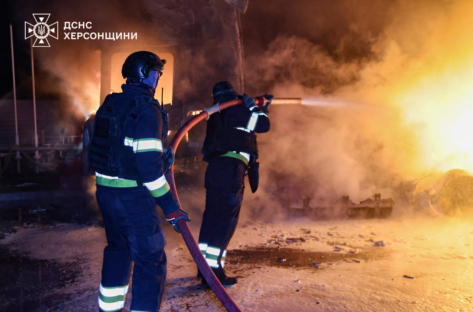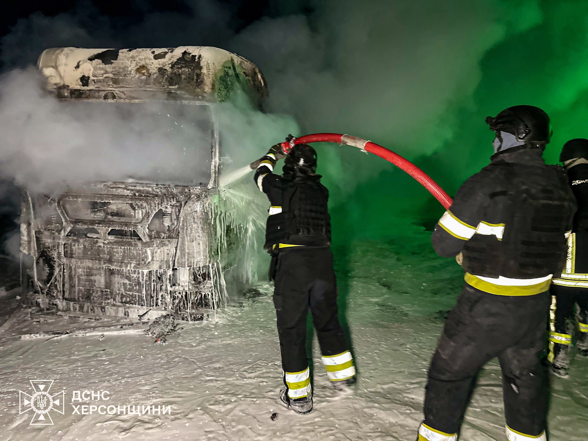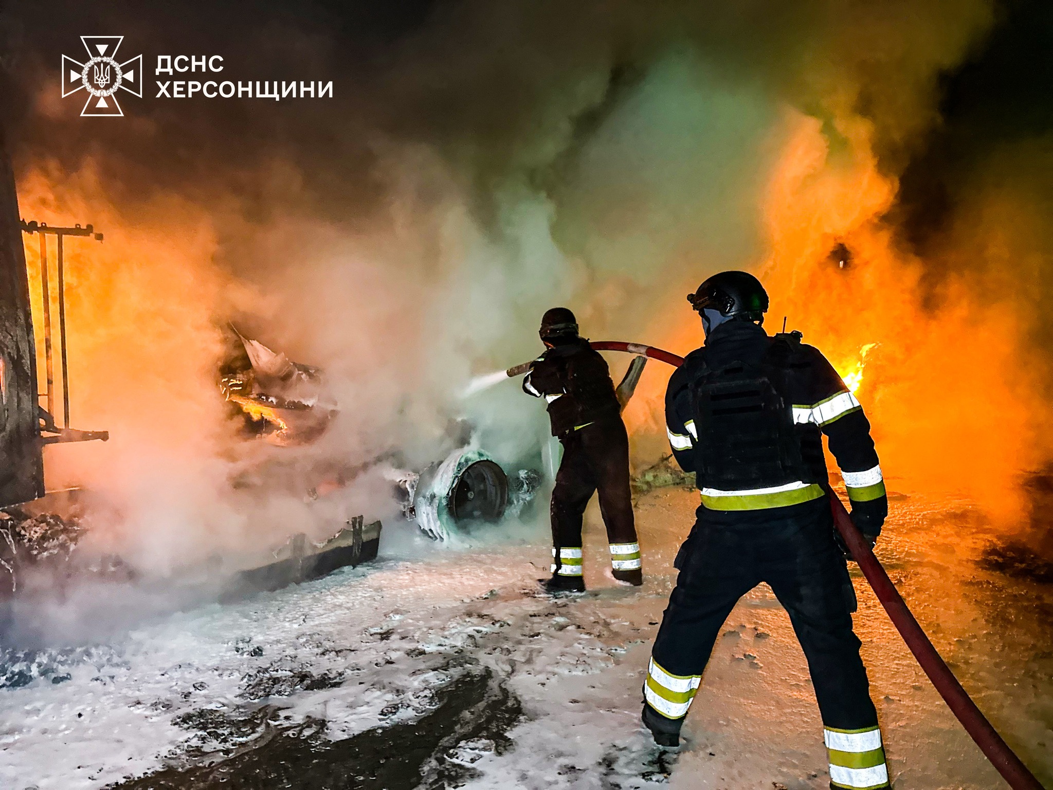 В результате попадания в грузовой автомобиль с цистерной произошел взрыв и возник пожар, который потушили пожарные, сообщили в ГСЧС Херсонской области. Никто не пострадал.