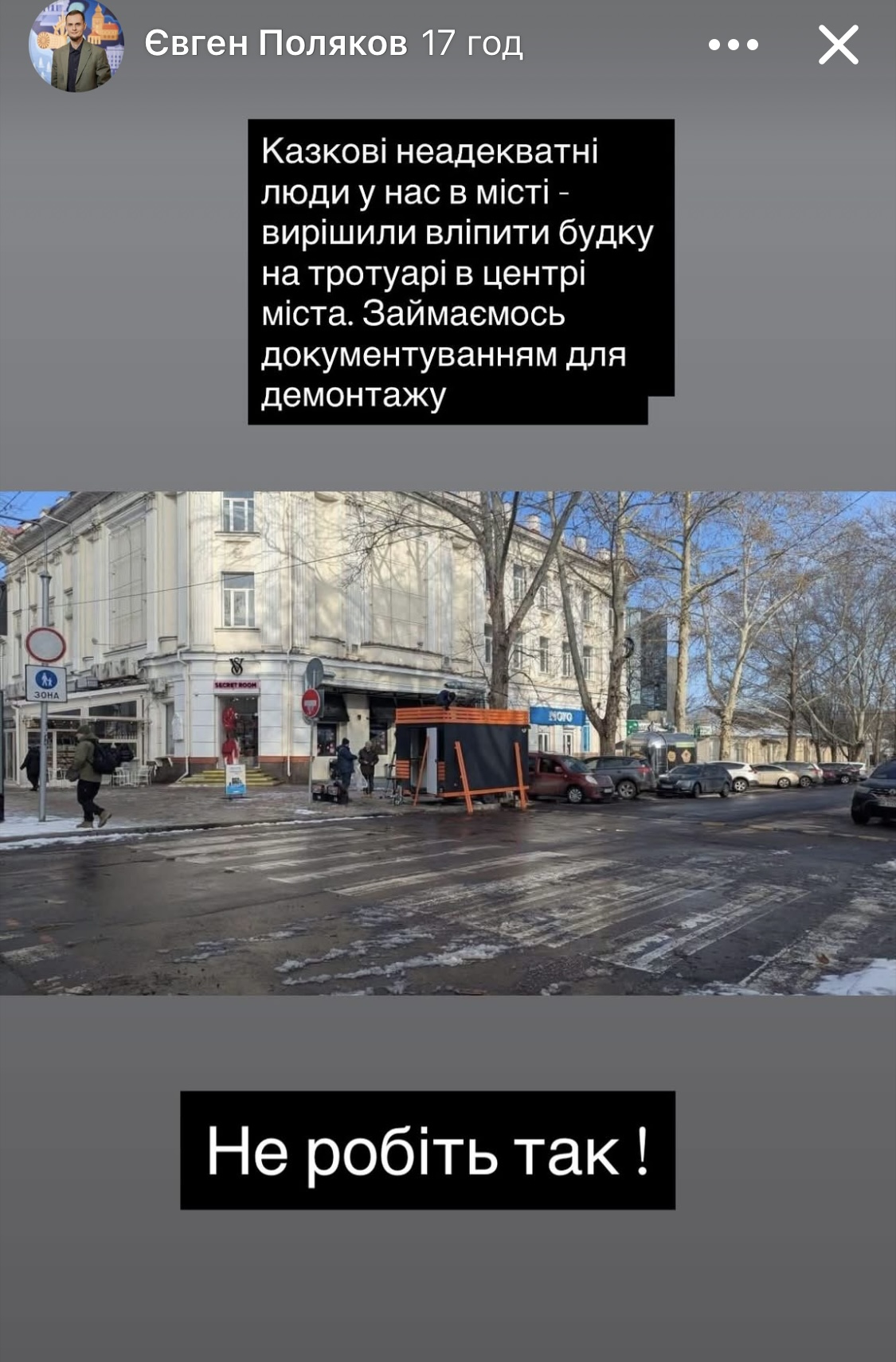 — Сказочные неадекватные люди у нас в городе решили влепить будку на тротуаре в центре города. Занимаемся документированием для демонтажа. Не делайте так, — написал Евгений Поляков у себя в истории в Фейсбуке.