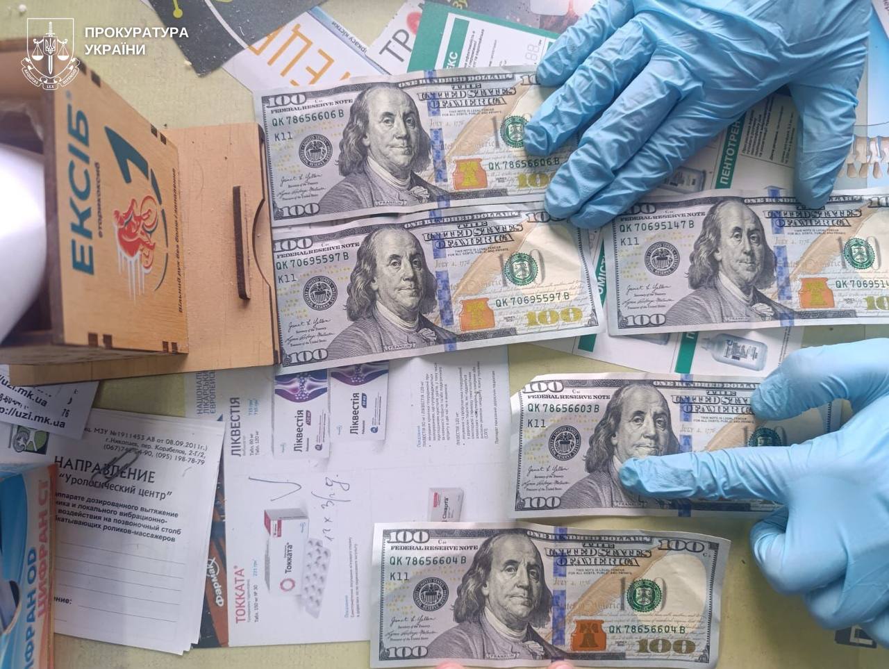 Во время обысков правоохранители изъяли более 100 тысяч долларов, 3,6 тысячи евро, более 200 тысяч гривен, мобильные телефоны с перепиской и поддельные медицинские документы.