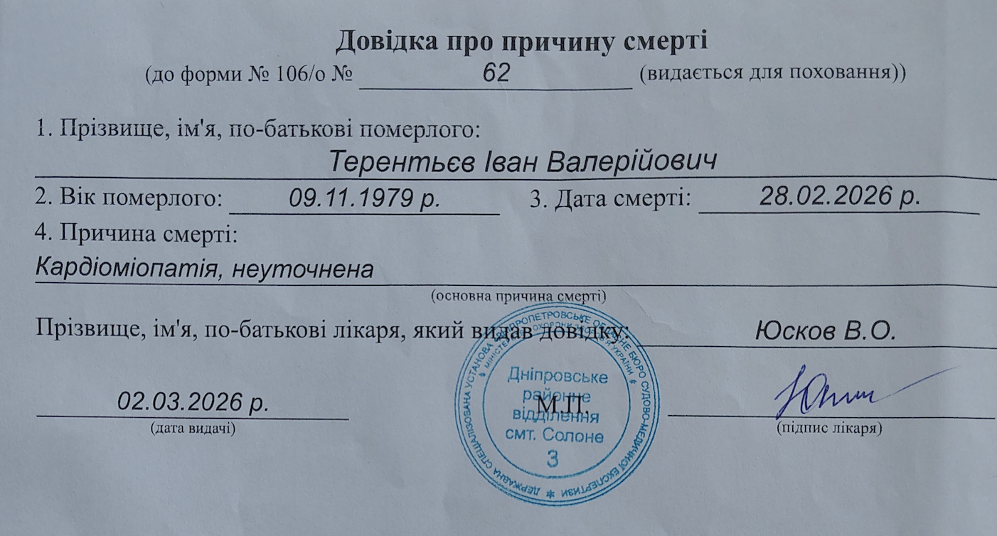 Инцидент произошел в учебном центре воинской части 425-го отдельного штурмового полка «Скала» в Днепропетровской области. 46-летний Иван Терентьев прибыл в учебный центр 25 февраля, а уже на следующий день он якобы пожаловался на недомогание, говорит семья погибшего.