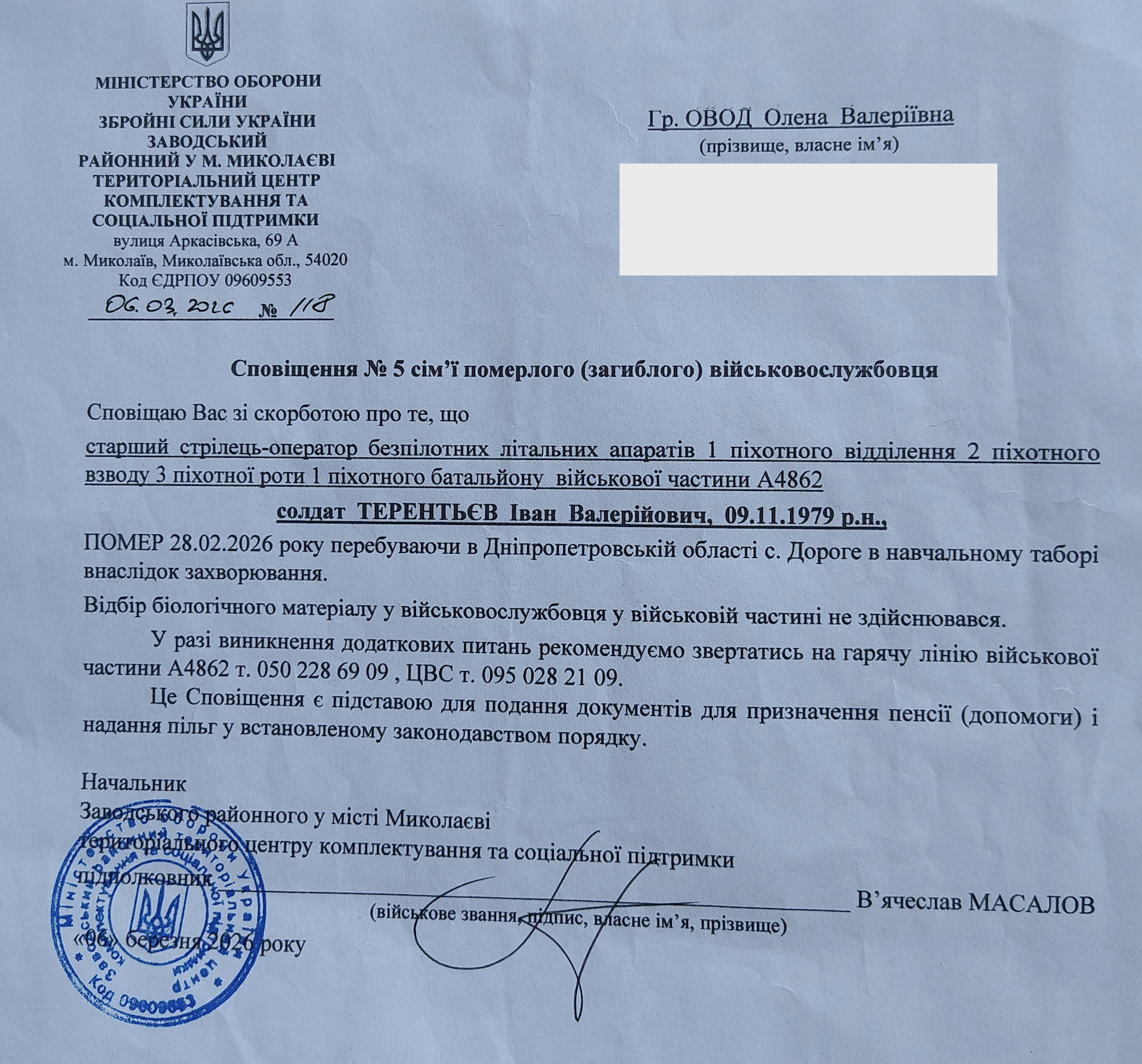 Через три дня военный скончался — 28 февраля. Семью об этом уведомили через неделю — 7 марта, предоставив документ «уведомление об умершем военнослужащем».