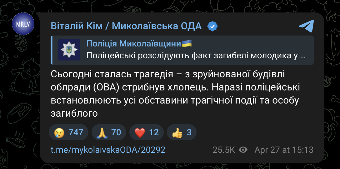 Сегодня днем, 27 апреля, из разрушенного здания Николаевской ОГА и облсовета прыгнул молодой человек. Он погиб.