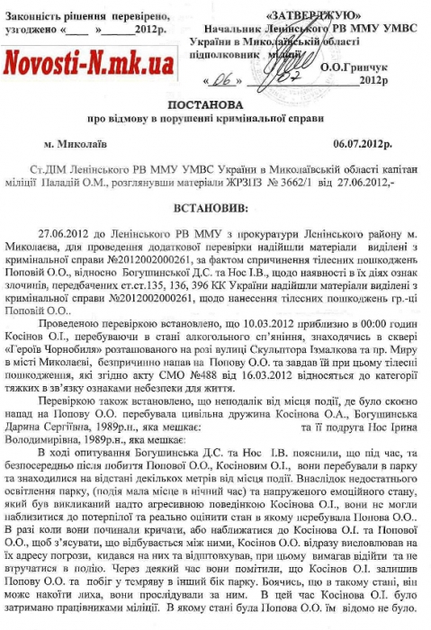В Ленинском районном отделении милиции вынесли постановление об отказе в возбуждении уголовного дела в отношении Дарьи Богушинской и ее подруги Ирины Нос, которые наблюдали, как Александр Косинов избивал 18-летнюю Александру Попову.