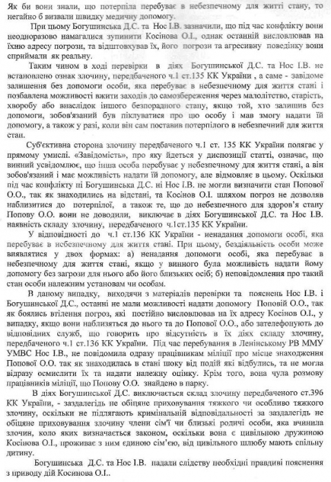 В милиции установили, что в момент избиения Богушинская и Нос находились в нескольких метрах от места событий, но «из-за недостаточного освещения парка и напряженного эмоционального состояния не могли приблизиться к потерпевшей и реально оценить состояние Поповой». Кроме того, дамы заявили, что неоднократно пытались остановить Косинова, но последний «высказывал в их адрес угрозы и отталкивал их, его угрозы и агрессивное поведение они воспринимали как реальные».