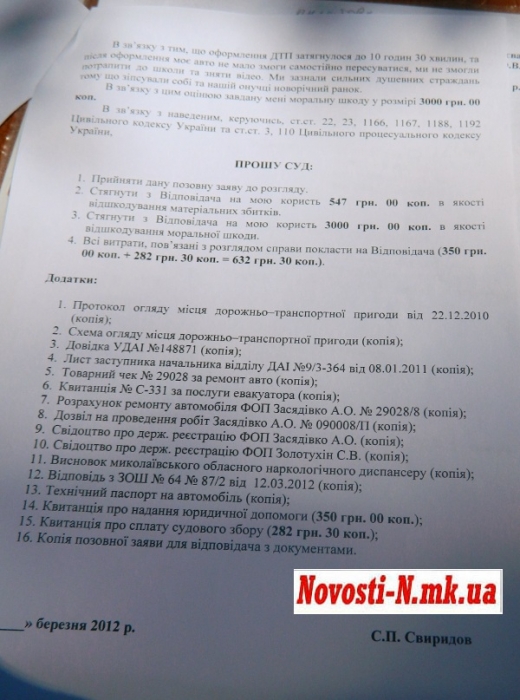 В своем исковом заявлении Сергей Свиридов просил «ЭЛУ автодорог» возместить ущерб в сумме 547 грн., а также моральный ущерб (за то, что по вине предприятия истец не попал на утренник к внучке) — 3000 грн., и сумму, потраченную на рассмотрения судебного дела, — 632 гривны 30 копеек.